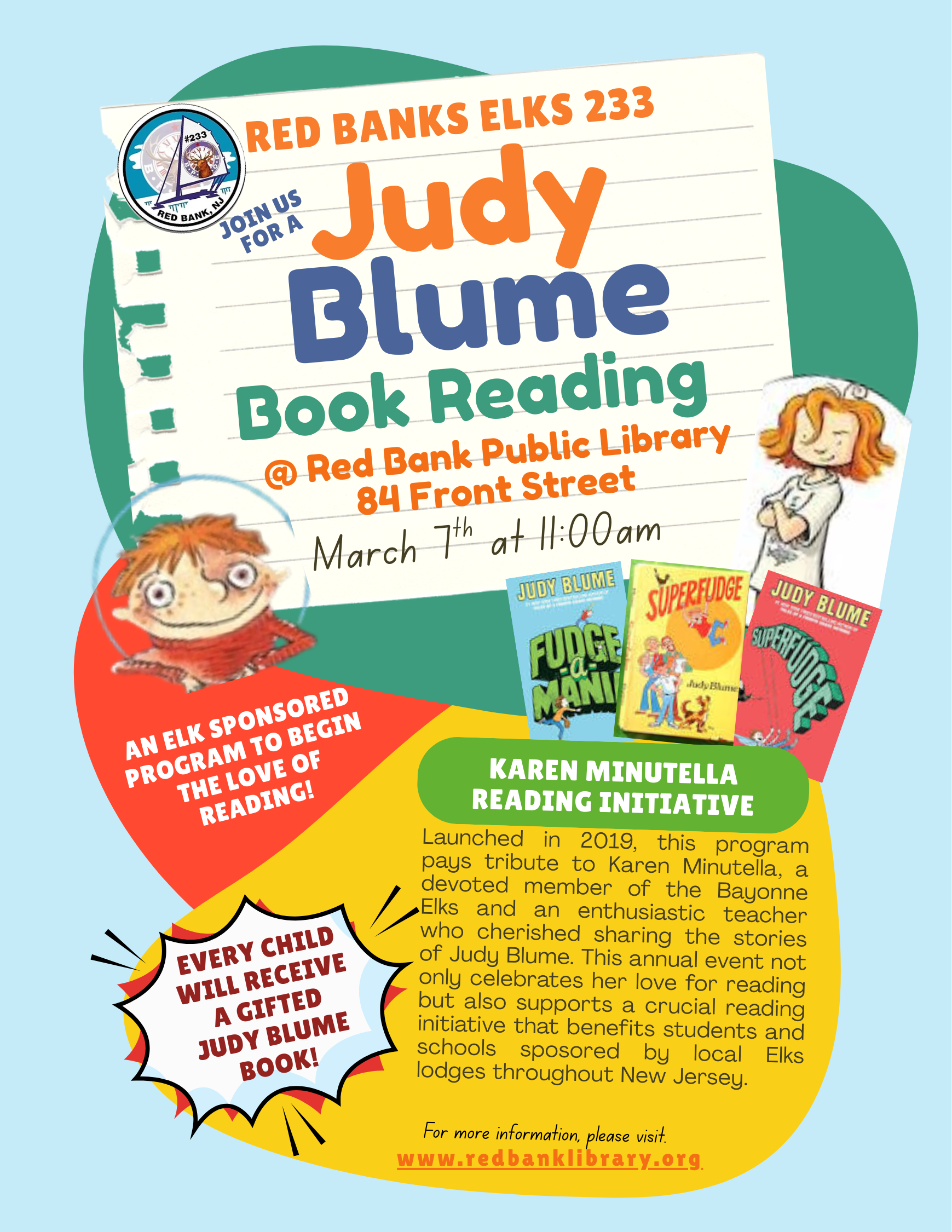 Karen Minutella Reading Initiative Saturday, March 7, 2026 11:00 AM 12:00 PM 11:00 12:00 Google Calendar ICS Red Bank Elks present the Karen Minutella Reading Initiative on Saturday, March 7th at 11AM.