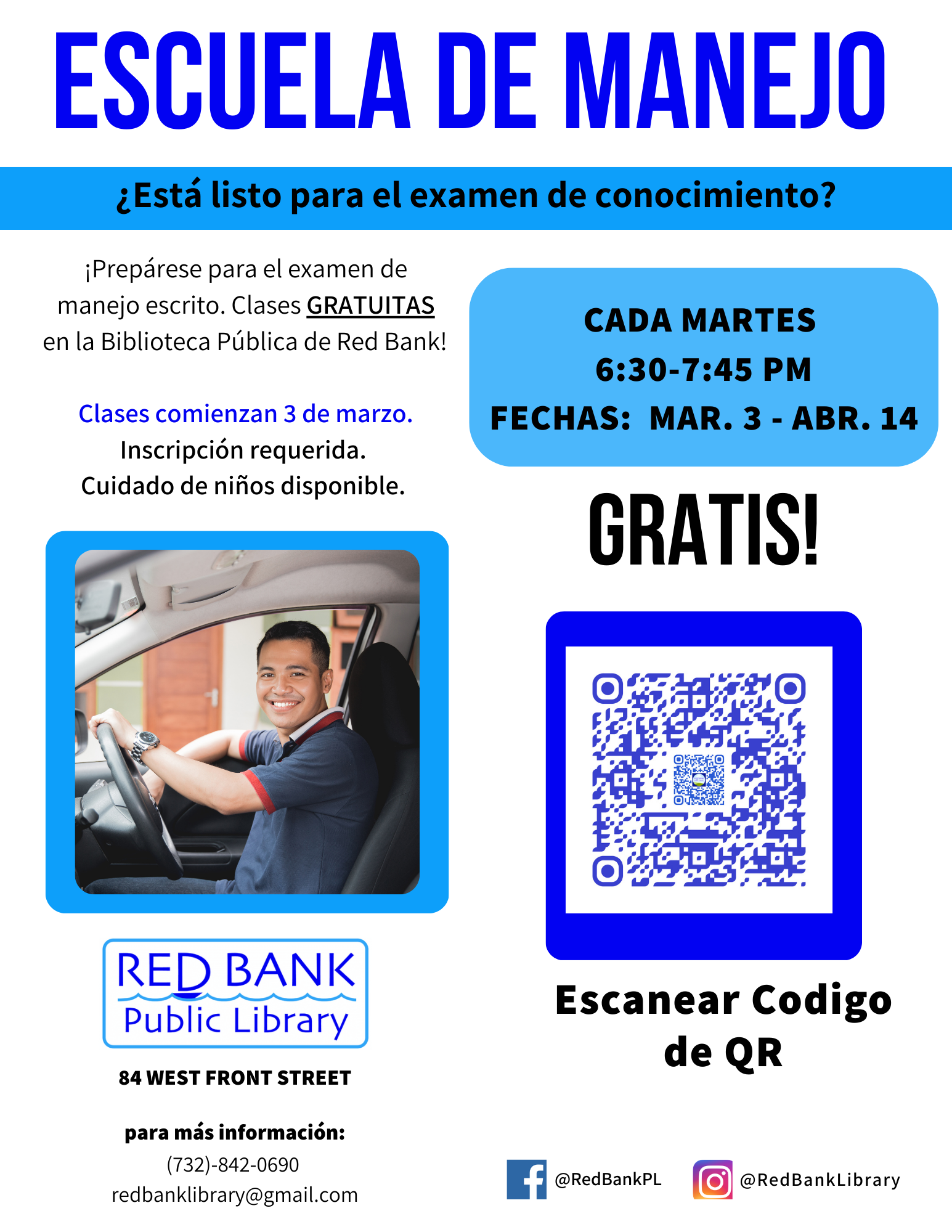¡Prepárese para el examen de manejo escrito. Clases GRATUITAS en la Biblioteca Pública de Red Bank!