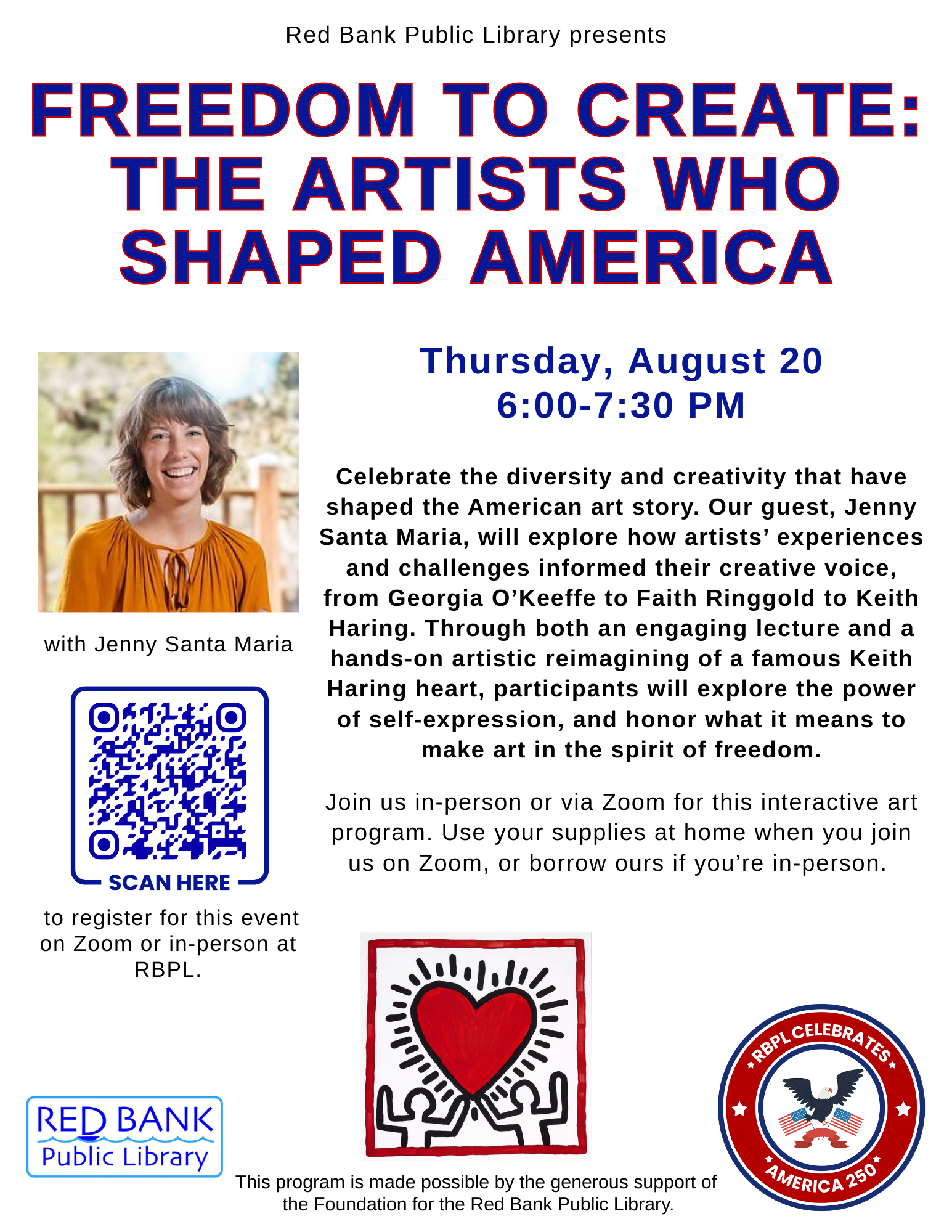 We’ll explore how each artist’s experiences and challenges informed their creative voice—from Georgia O’Keeffe’s meditative connection to the natural world, to Faith Ringgold’s storytelling quilts that wove art and activism together, to Keith Haring’s bold visual language created in service of social change. Together, their work honors the freedom to create and the many voices that form our shared story. Through an engaging lecture and hands-on art-making session, participants will explore the power of self-expression and create original works inspired by the techniques and stories of these groundbreaking artists—celebrating what it means to make art in the spirit of freedom.