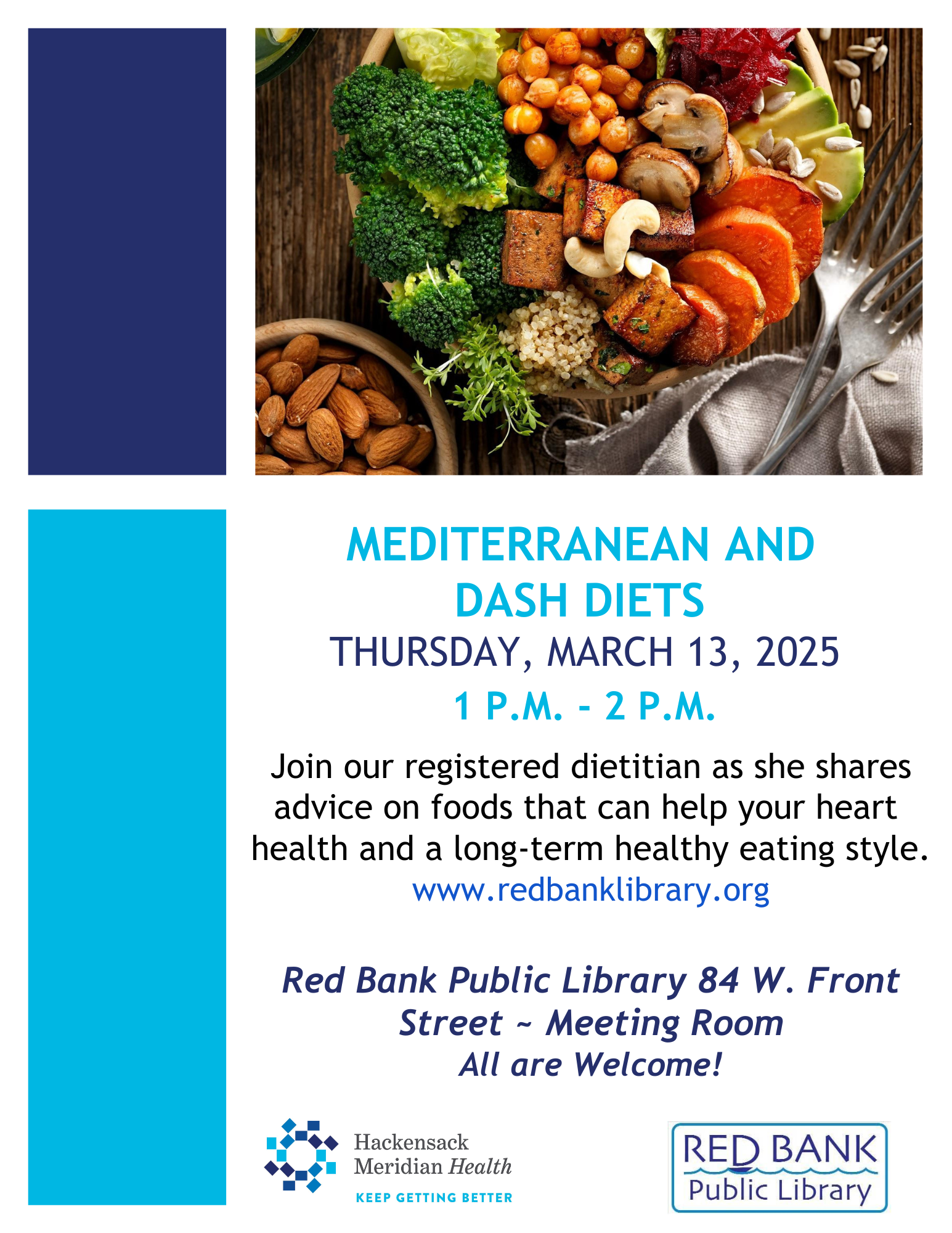 Stop by our Meeting Room on Thursday afternoon for an educational and interactive presentation on the benefits of a Mediterranean and DASH diet.