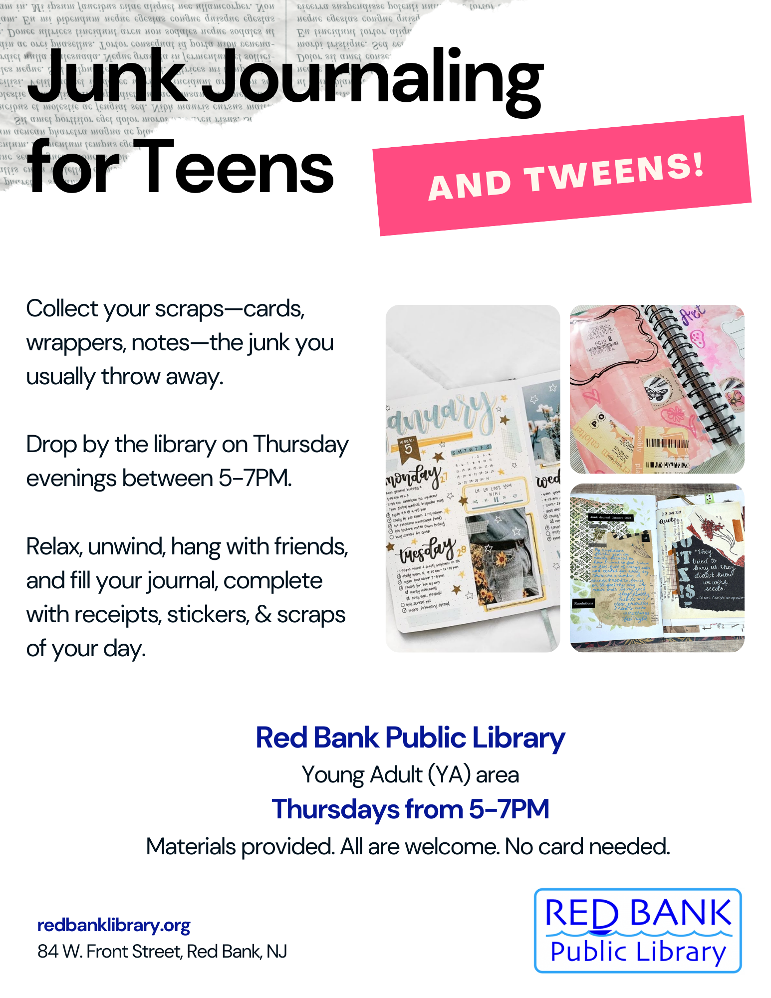 All teens and tweens are invited to drop by our Young Adult area to document their week during junk journaling. We provide inspiration, supplies, place to hang, and fun.