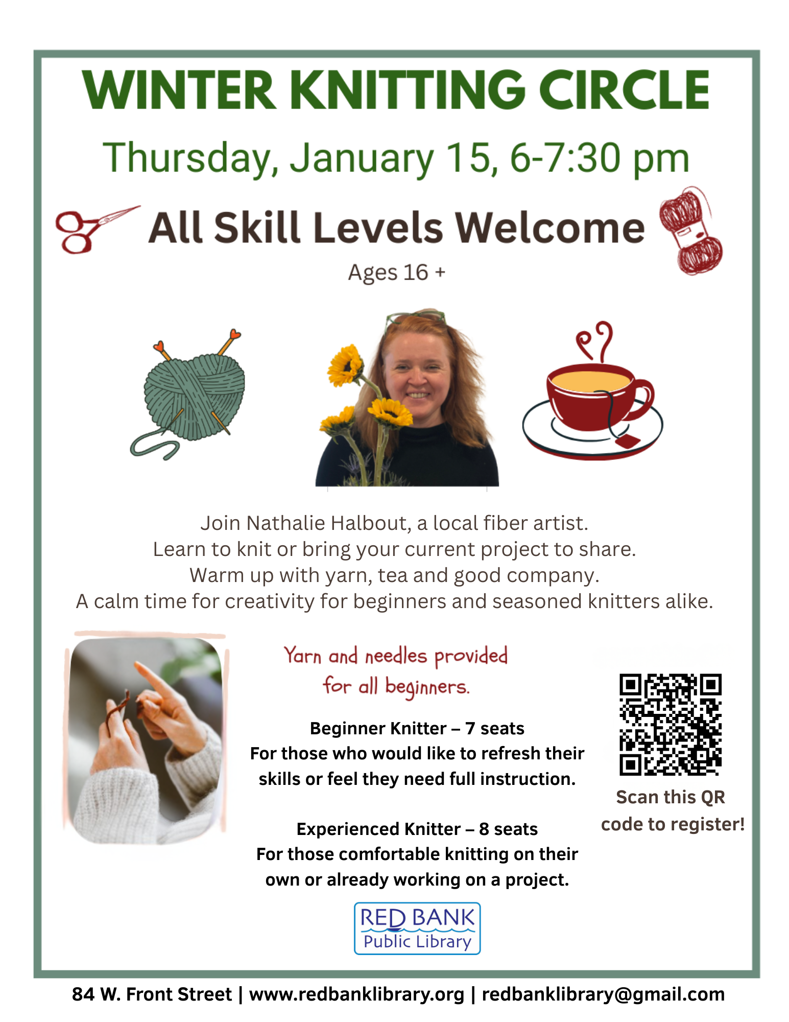 Join Nathalie Halbout, a local fiber artist, to learn to knit, or bring your current project to share. Warm up with yarn, tea and good company. A calm time for creativity for beginners and seasoned knitters alike. Yarn and needles provided to all beginners.